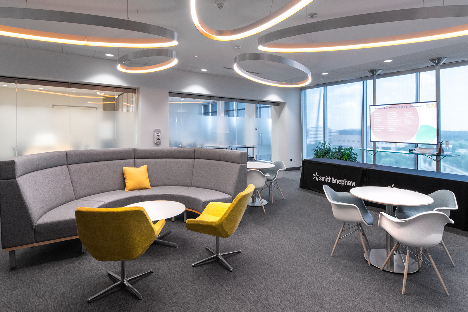 A 60,000 SF interior finish-out was completed for Smith & Nephew to support their medical technology operations. The space includes open office areas, collaboration zones, conference rooms, and more, all designed for efficiency and innovation.