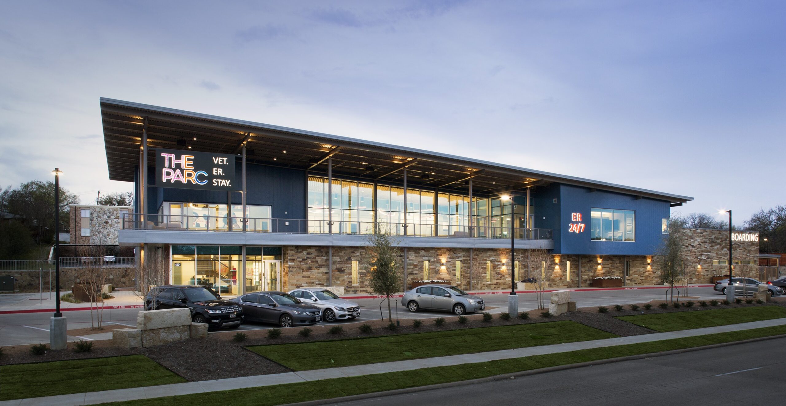 This new ground-up 25,000 SF veterinary clinic and animal hospital is designed to provide a high-end experience for both pets and their owners. The facility features glass-enclosed surgery rooms that allow pet owners to observe procedures, creating a unique level of transparency and comfort. The two-story building is constructed with a steel frame and includes a stucco, stone, and glass curtain wall exterior, a standing seam metal roof system, and an underground stormwater detention system that supports long-term site performance.